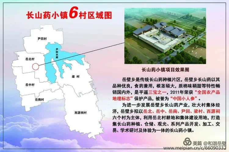 建设背景:岳壁乡是传统长山药种植片区,岳壁乡长山药以其品种优良,食药兼用,根茎硕大,质棉味稍甜等特性畅销国内外,是平遥三宝之一,2011年荣获“全国农产品地理标志”保护产品,被誉为“中国小人参”。
